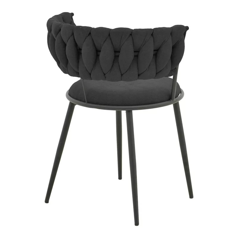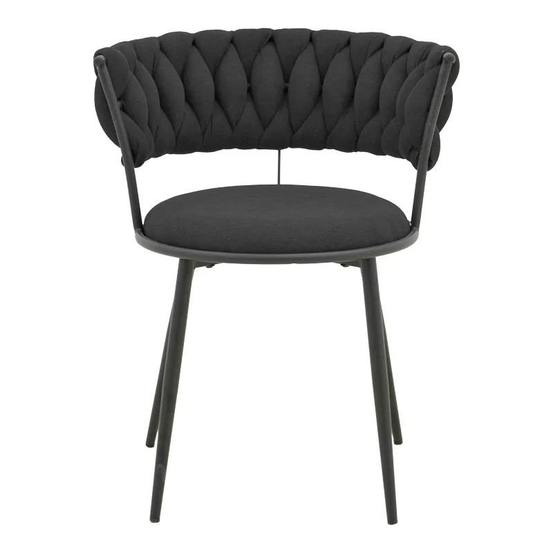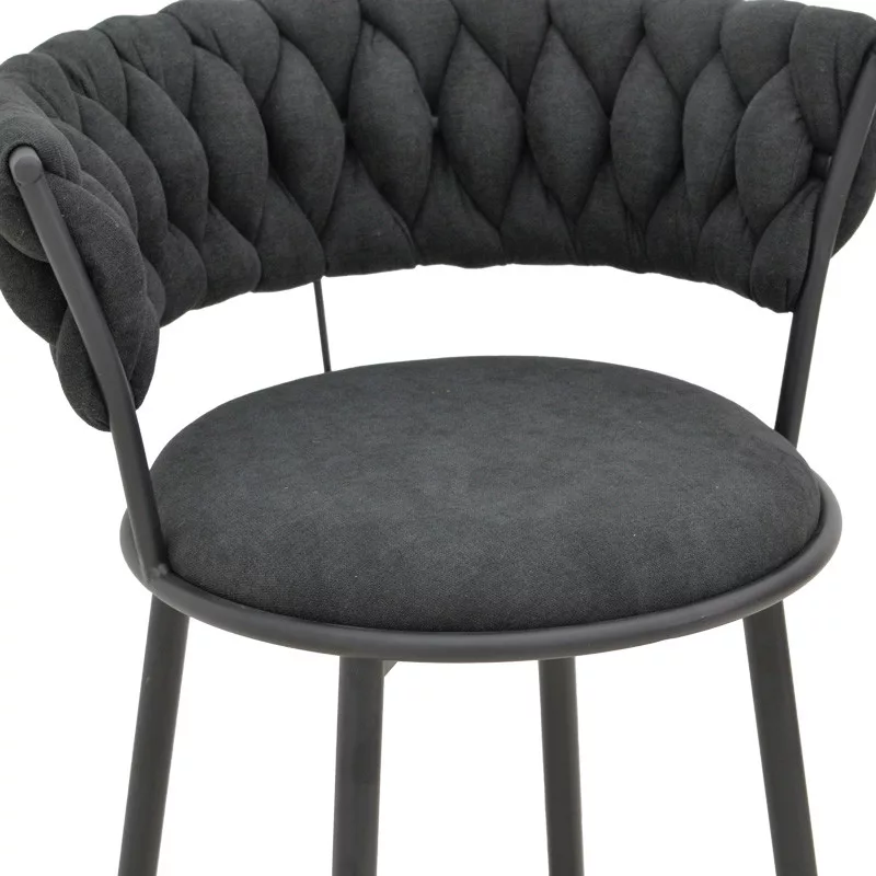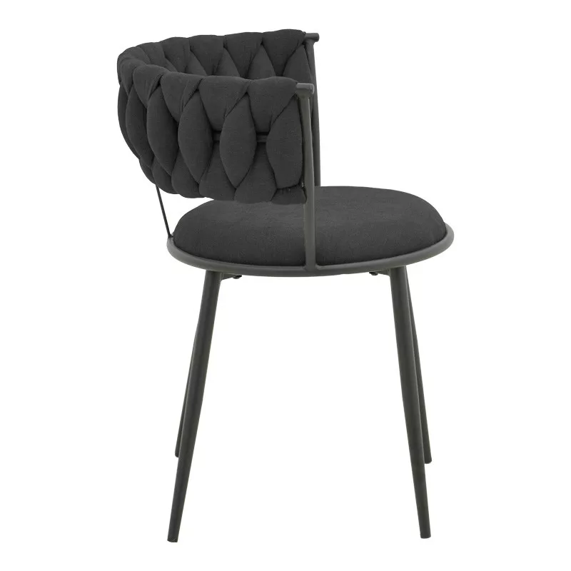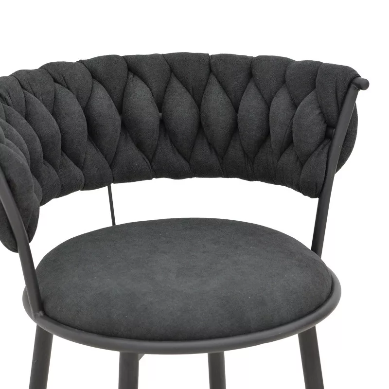 The geometric weave on the backrest adds a sense of modern elegance, supported by slim yet sturdy metal legs with a matte black finish. This seat harmoniously combines aesthetics with functionality.