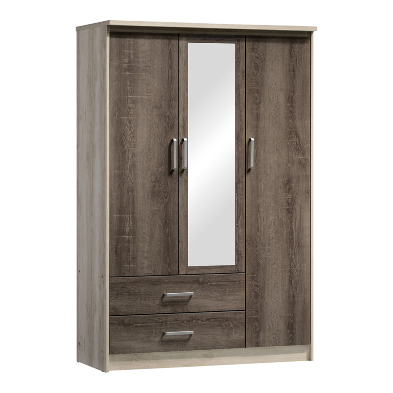 Includes two large doors with an internal hanging rod and one narrow door with three internal shelves. At the bottom, there are two large drawers for storing clothes and accessories.