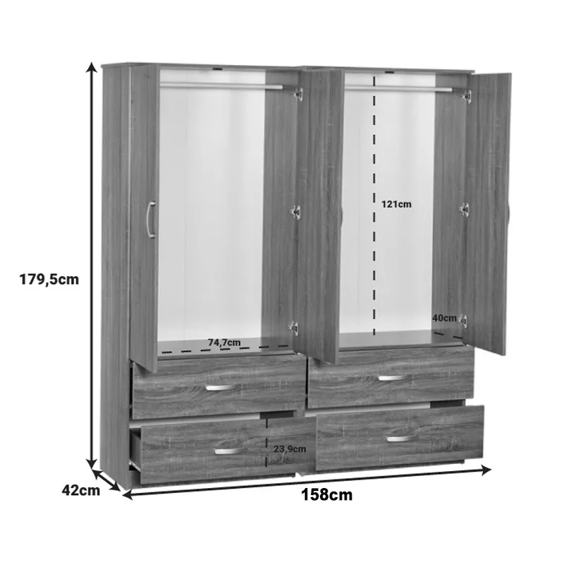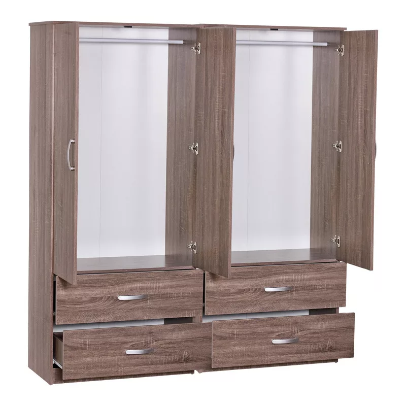 - Includes four large doors, inside has a rail for hangers and two large drawers below for storing clothes and accessories.
