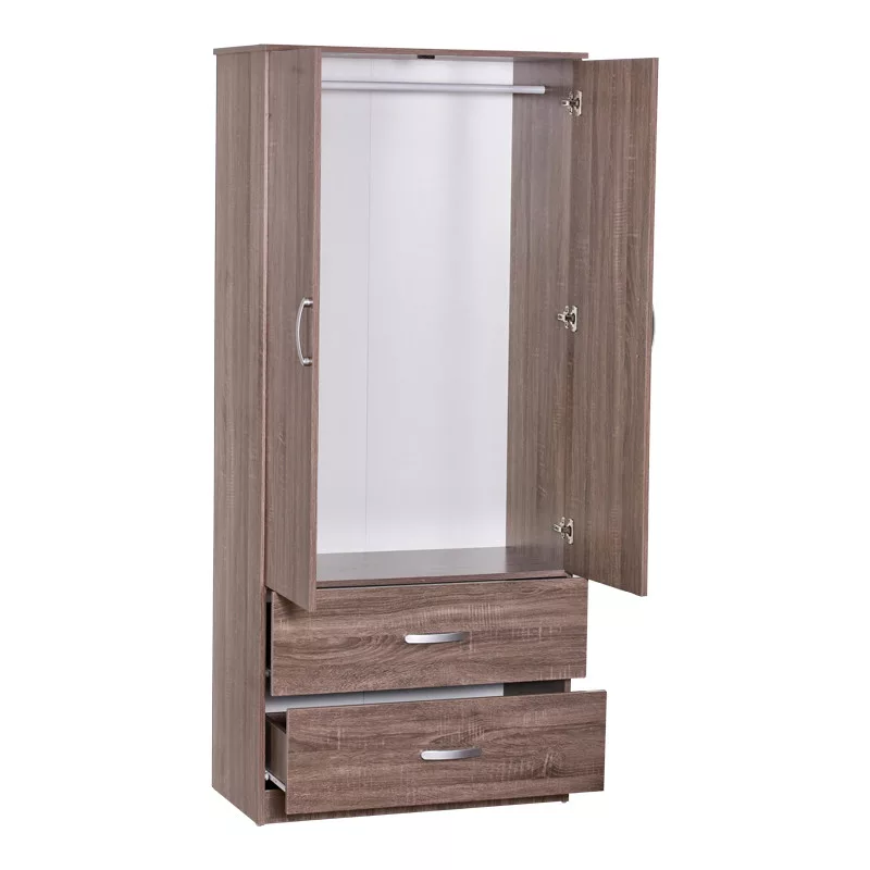 - It includes two large doors, inside it has a rail for hangers and below two large drawers for storing clothes and accessories.