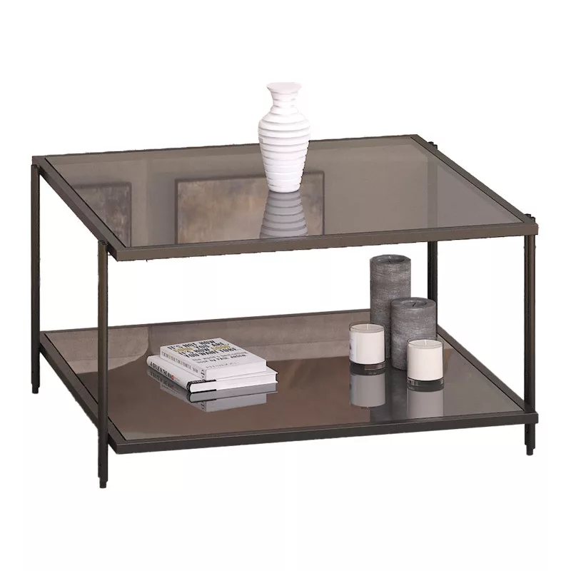 The Fuaca metal coffee table features a minimalist and elegant design, combining the durability of metal with the transparency of glass. Its structure is based on a black-finished metal frame that supports two smoke glass surfaces, offering ample space for various items while maintaining an airy feel.