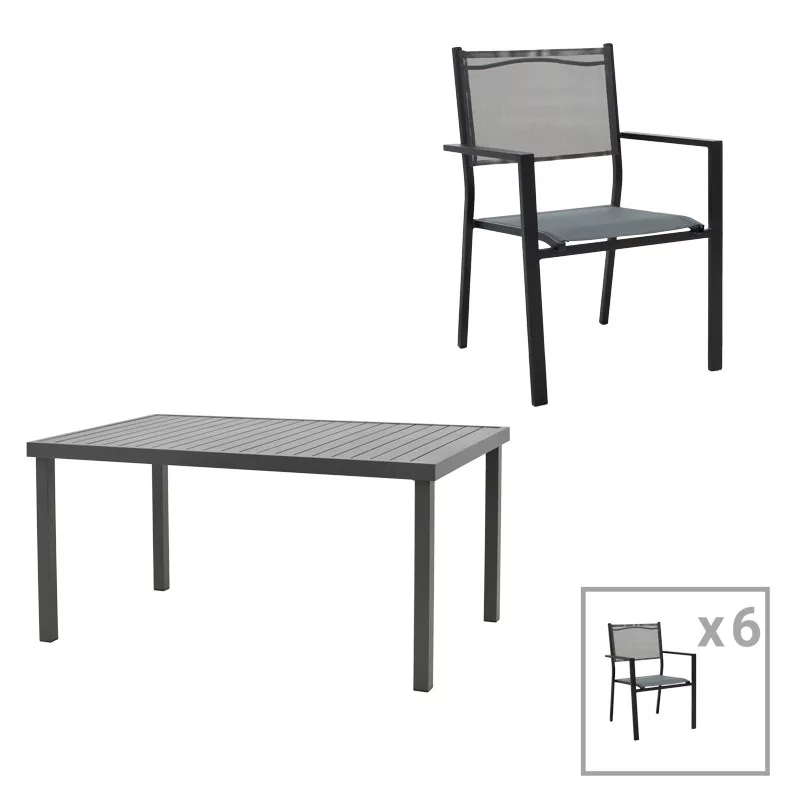 The set consists of six armchairs and a table.Technical characteristics of the table: • Aluminum construction. Aluminum is an extremely durable material for outdoor use as it withstands weather conditions without corroding or rusting. It's also lightweight and easy to move around, making it ideal for outdoor use.