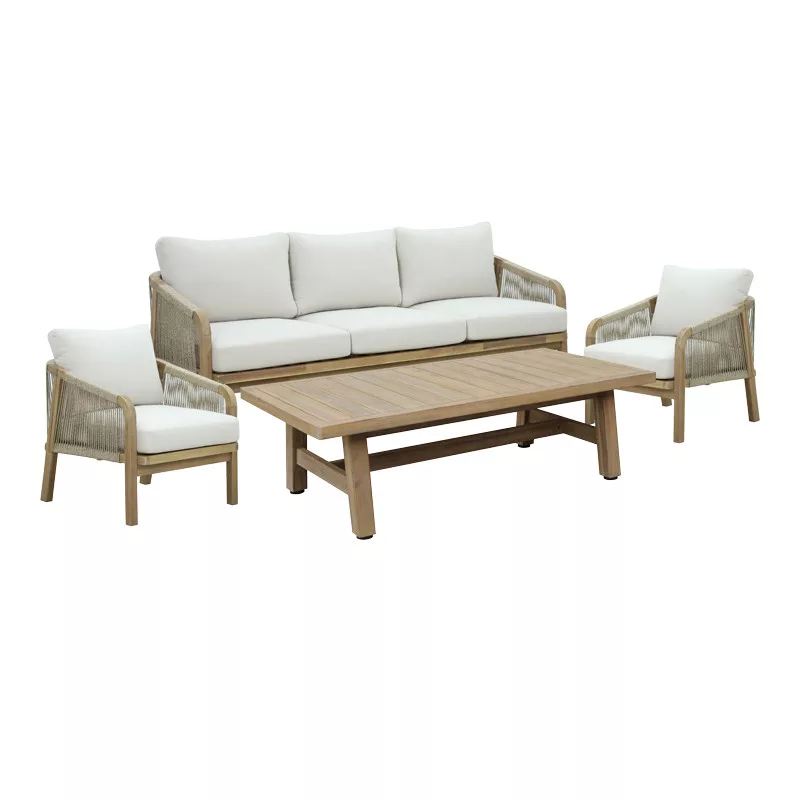 The Malibu I garden lounge consists of a three-seater sofa, two armchairs and a table. It is made of durable natural acacia wood. Its natural and strong resistance combined with its beauty make it an ideal wood for outdoor furniture. It can be used for home and professional use.