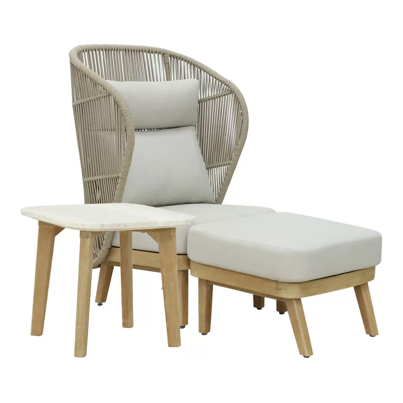 Nicholas pakoworld 3pc living room set solid eucalyptus wood-beige fabricThe Nicholas set consists of an armchair, a stool and a table. It is made of durable natural eucalyptus wood. Its natural and strong resistance combined with its beauty make it an ideal wood for outdoor furniture. It can be used for home and professional use.