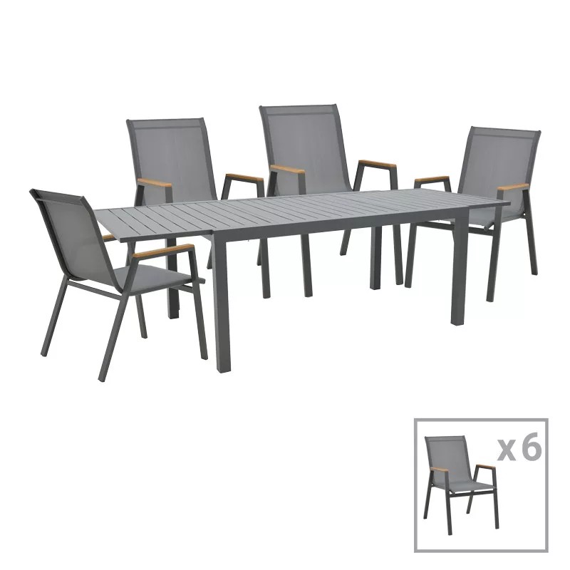 Azelie-Lafla dining table pakoworld set of 7 anthracite fabric-anthracite aluminumAre you looking for a durable and impressive dining table for your balcony or garden that will aesthetically upgrade your space? Then the choice of Azelie-Lafla is ideal for you as it combines aesthetics with quality construction.