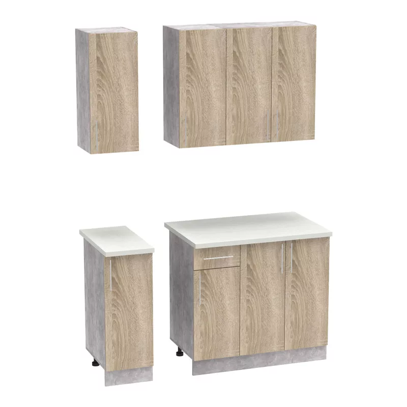 - Bottom: One double cabinet, one single cabinet, and one cabinet with a drawer.