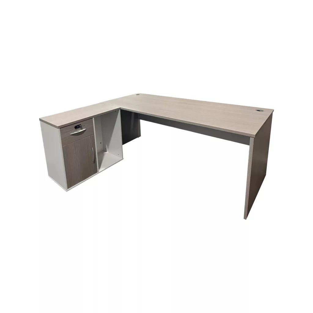 - Side unit includes a drawer, a cabinet for storing essential items, and a ventilated space for your computer tower.