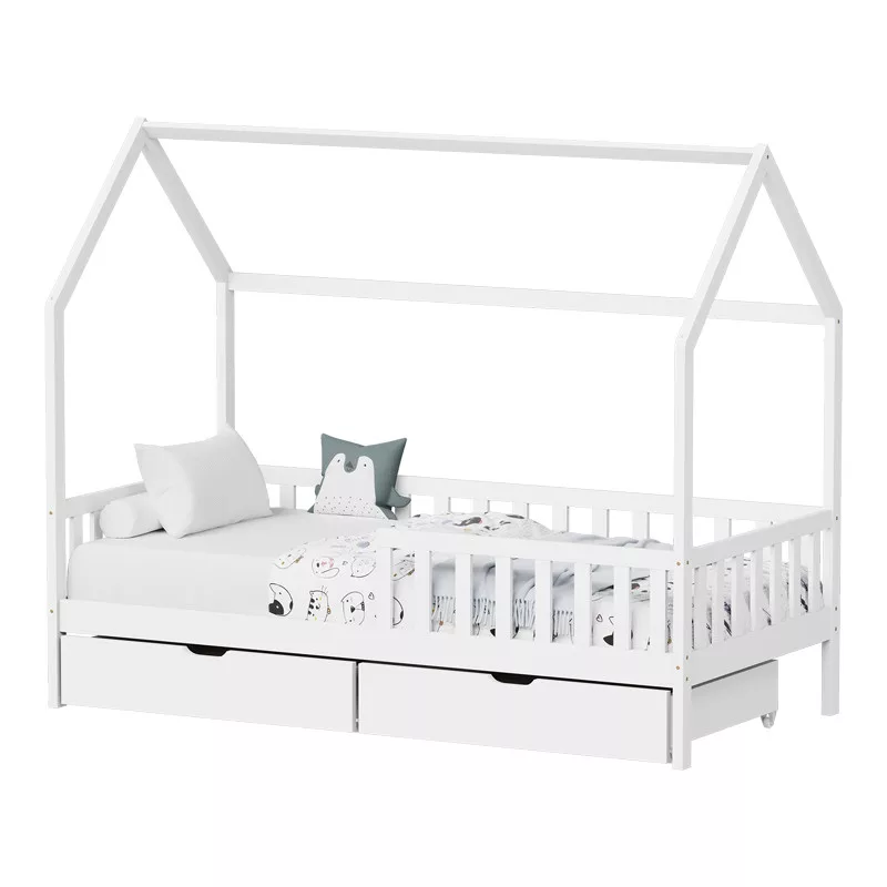 Piccolo Montessori House Bed with Rails and Storage DrawersThe Piccolo Montessori bed combines modern, friendly design with a house-like shape, featuring clean lines that create a sense of warmth and comfort, making it perfect for any child’s room. Its roof adds a playful element, transforming it into a cozy haven for children, while the storage drawers provide extra space for toys, books, or other essentials, keeping the room organized.